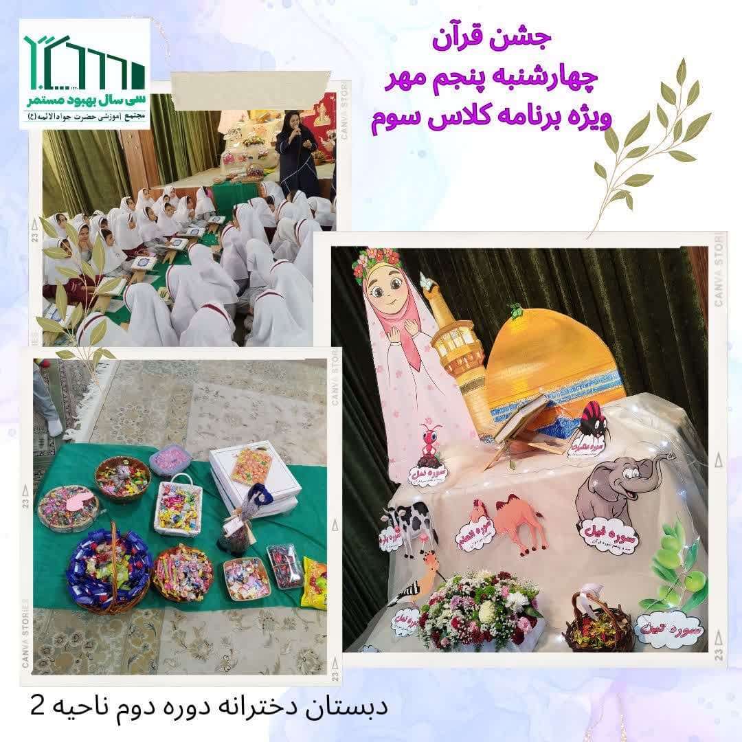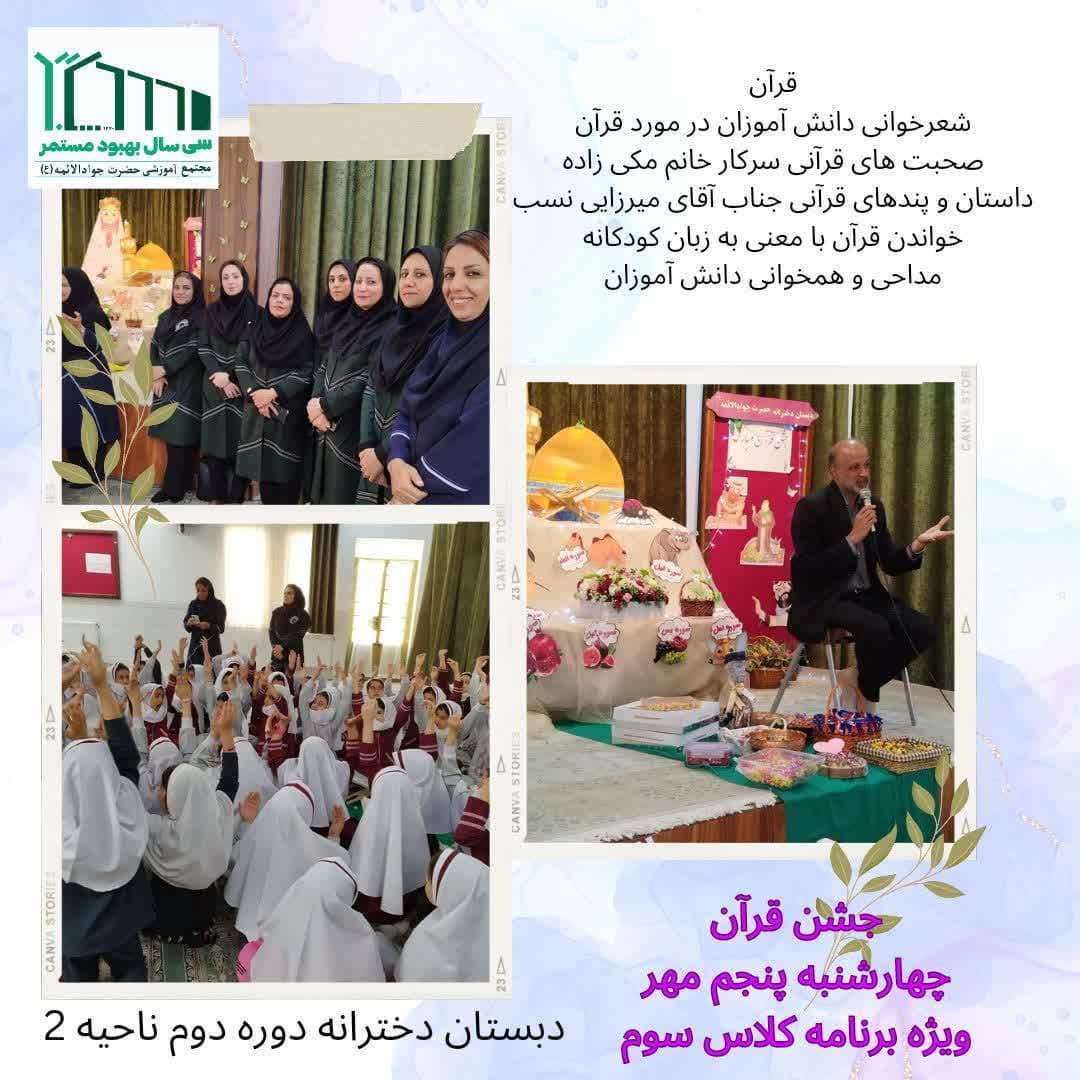 برنامه های اجرا شده در این جشن : شعرخوانی دانش آموزان در مورد قرآن صحبت های قرآنی مدیریت آموزشگاه داستان و پندهای قرآنی جناب آقای میرزایی نسب خواندن قرآن با معنی به زبان کودکانه مداحی و همخوانی دانش آموزان